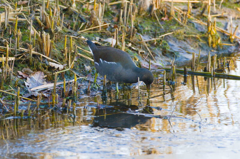Op de grens van land en water en water en ijs. Al rondpikkend zwierf deze waterhoen door de rietstoppels om vervolgens even naar beneden te komen voor wat water.